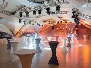Небольшой шатёр для банкетов и обучающих интенсивов на свежем воздухе. Позволяет разместить до 150 человек театром.